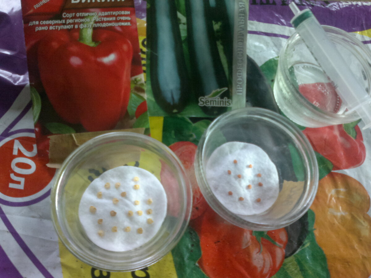 1 марта началась подготовка семян: сладкие и острые перцы были замочены на сутки в растворе воды с добавлением «Эпина». Семена помещаются в диски, обмазываются раствором и оставляются в тепле.