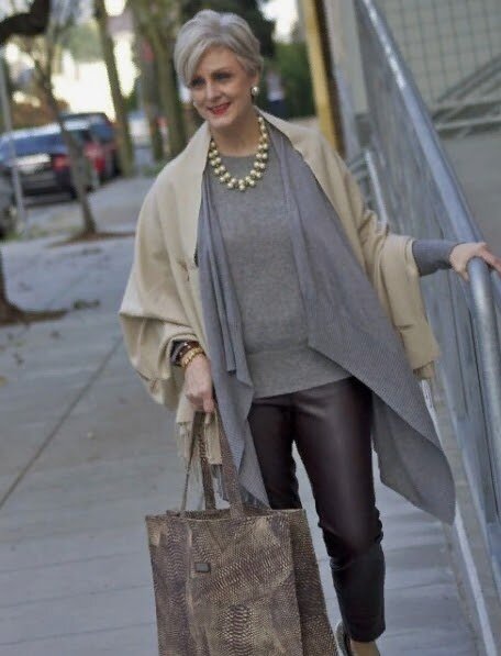 Мнение о том, что кожаная одежда подходит только молодым, устарело. Свободно скроенные кожаные брюки отлично сочетаются с легким кашемировым пуловером серого цвета. Образ дополняет стильный палантин и вместительная сумка в тон. Это сочетание позволит выглядеть модно в любом возрасте.