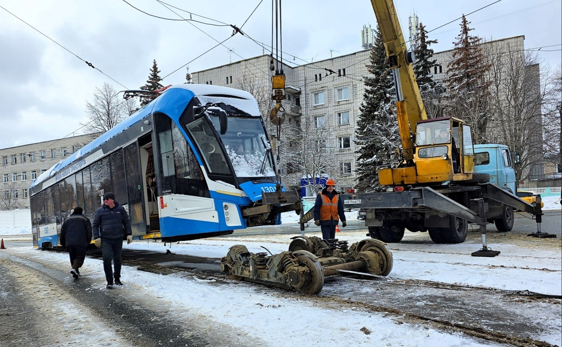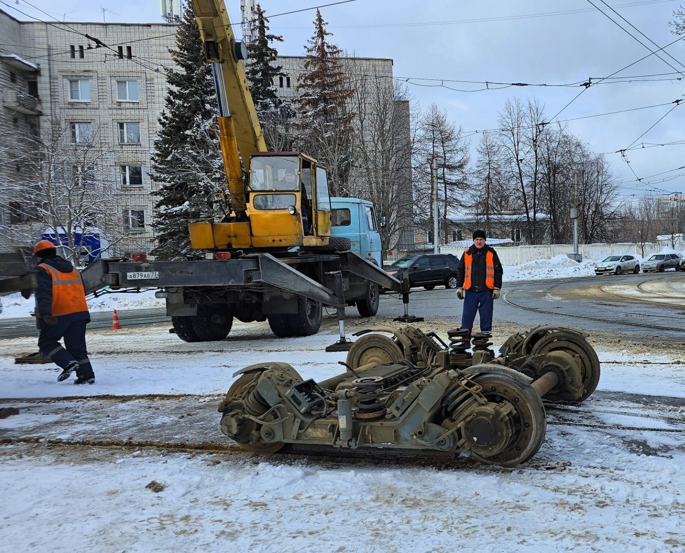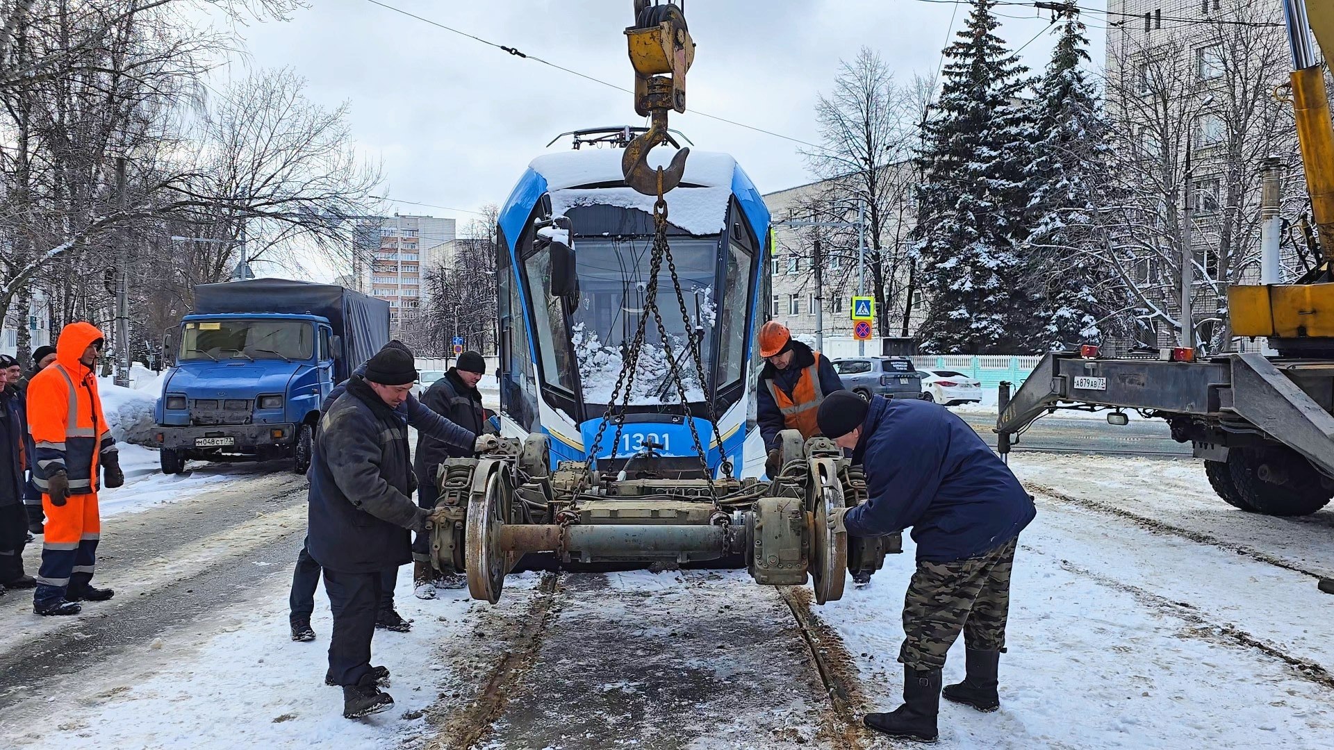 Ремонтная бригада привезла из депо новую тележку. С помощью крана вагон приподняли и заменили передние колёса. После этого трамвай своим ходом доехал до депо, где работу продолжили уже в ремзоне.