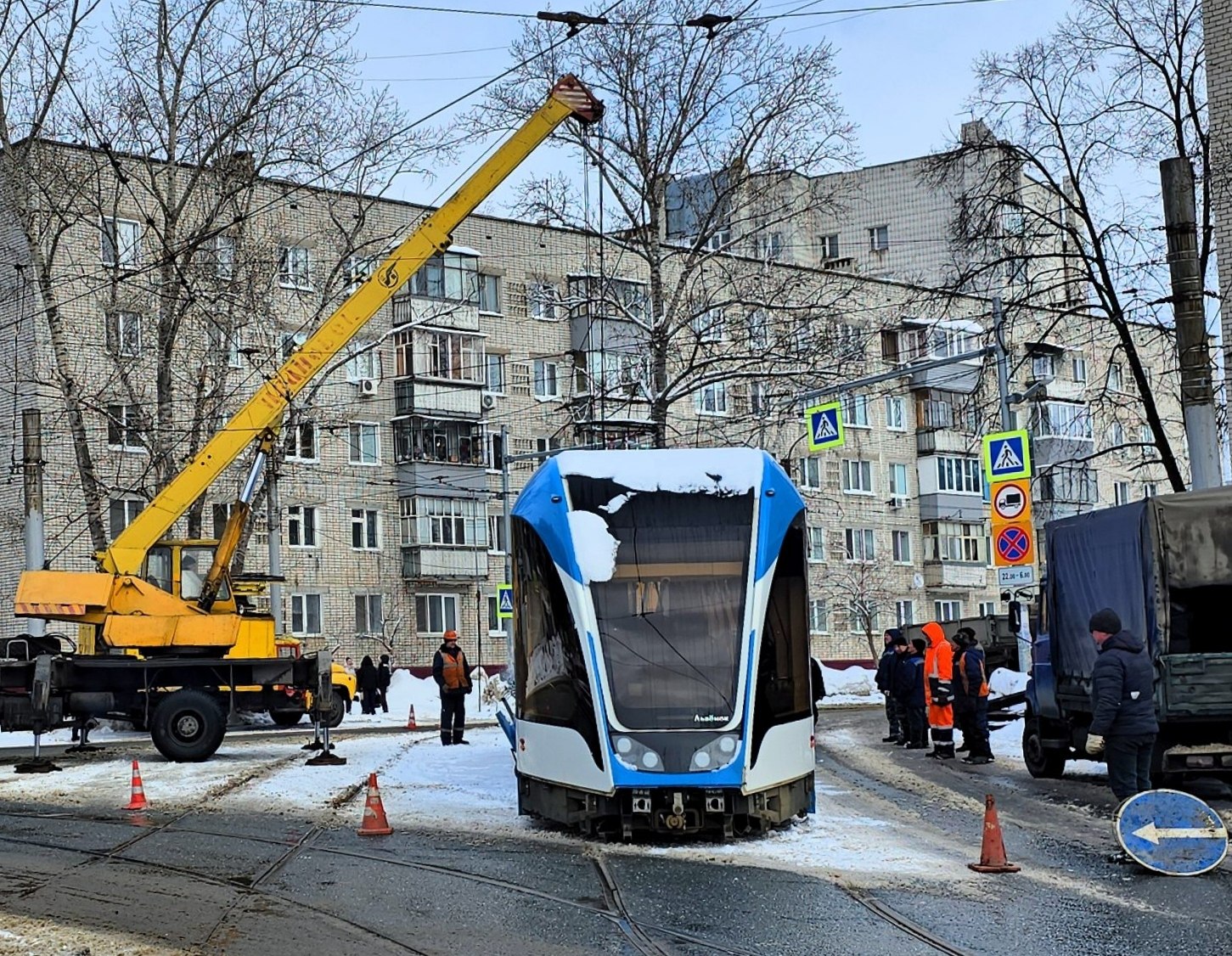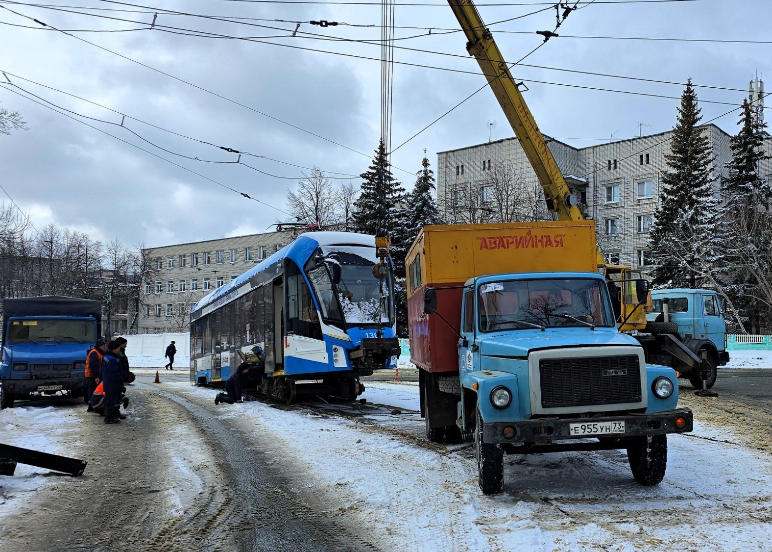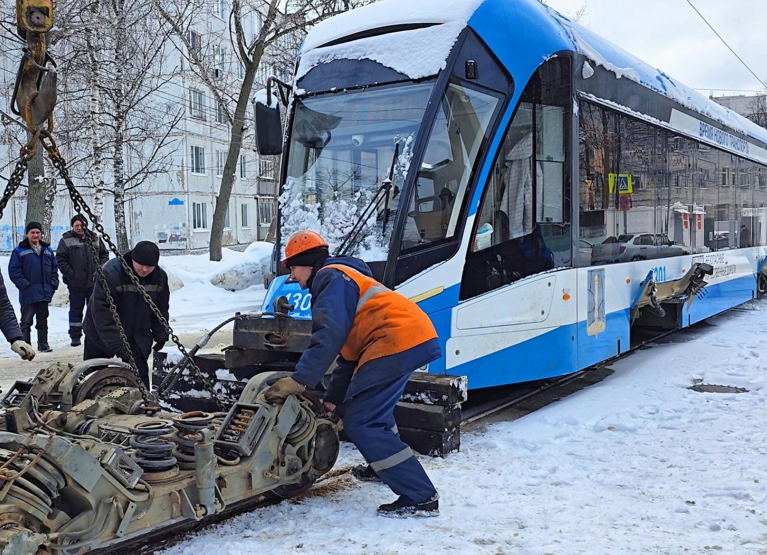 Ремонтная бригада привезла из депо новую тележку. С помощью крана вагон приподняли и заменили передние колёса. После этого трамвай своим ходом доехал до депо, где работу продолжили уже в ремзоне.