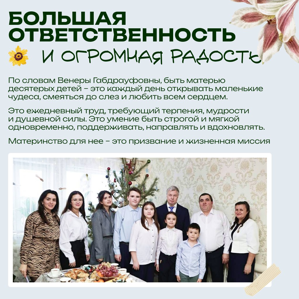 Одна из таких женщин – Венера Сатдинова, мама десятерых детей. В 2023 году она была награждена Орденом материнской славы.