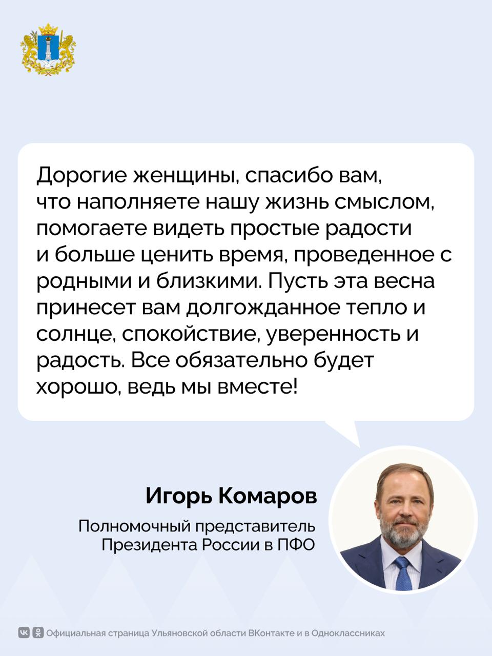 Полномочный представитель Президента России в Приволжском федеральном округе Игорь Комаров поздравляет с Международным женским днем