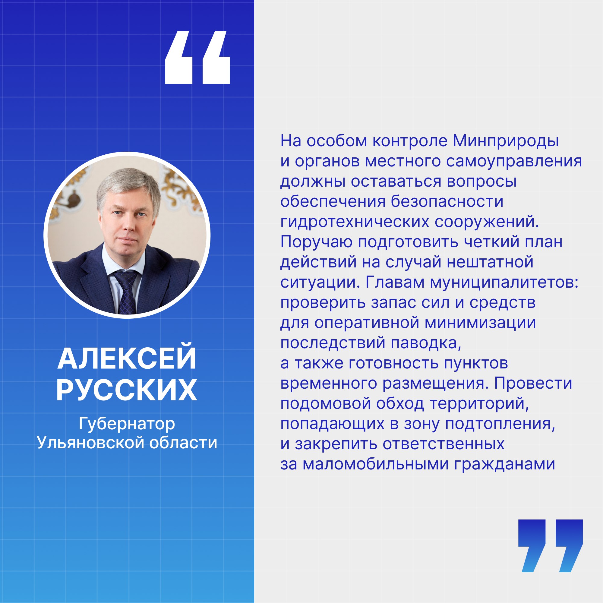 Губернатор поручил провести работы на гидротехнических сооружениях Ульяновска и Ишеевки для снижения уровня воды на реке Свияге. Также важно усилить взаимодействие с Пензенской и Самарской областями по контролю за сбросом воды на гидротехнических сооружениях на реках Суре и Сызранке, и организации работ для предотвращения заторов льда на реке Сызранке.