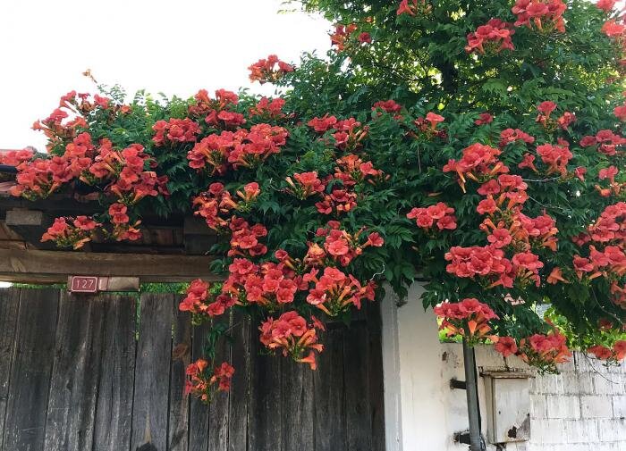 - Кампсис: Эта лиана известна своей способностью быстро разрастаться, оккупируя различные участки земли. Мощные корни кампсиса могут повредить асфальт и пробить тротуарную плитку, вызывая истончение и трещины. В тех дворах, где растет кампсис, нередко наблюдаются поднятые участки асфальта, что может негативно сказаться на прочности фундамента здания.