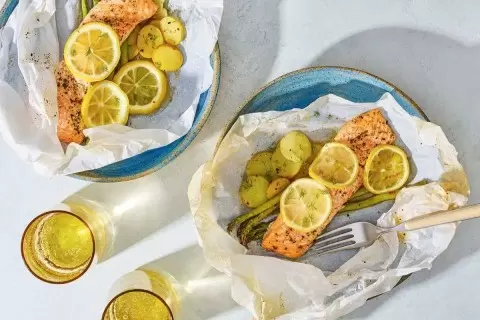 Плотная мягкость лосося достигается за счёт герметичности. Каждый лист помещается на большой квадрат бумаги, на него кладётся часть картофеля и спаржи, сверху — рыба и ломтики лимона. Затем бумага закрывается и закрепляется, чтобы пар не уходил лишний раз. Важно оставить небольшое пространство внутри, чтобы рыба не пережарилась и сохранила сочность.