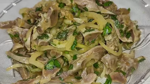 3. **Приготовление маринада**: Лук нарезается полукольцами, петрушку мелко шинкуют и добавляют к желудкам. Далее следует добавить сахар, соль, прессованный чеснок, соевый соус, уксус и подсолнечное масло. Все ингредиенты тщательно перемешиваются, после чего закуска накрывается пленкой и убирается в холодильник минимум на 2 часа для маринования.