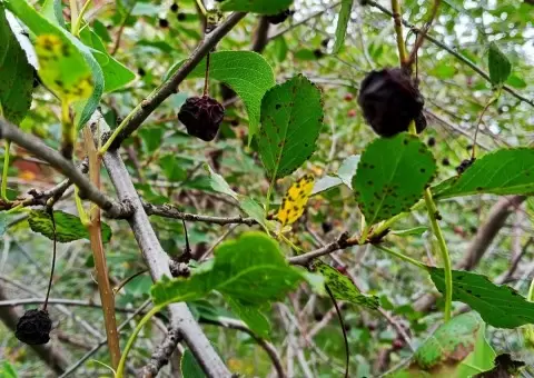 - Плодовая гниль: на плодах появляются бурые круги с серыми подушечками спор, которые затем ведут к «мумфикации» плодов и их прилипанию к веткам.
