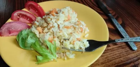 Далее рис нужно переложить к овощам в кастрюлю, добавить два стакана воды (в соотношении 1:2), посолить и добавить черный и душистый перец. При желании можно положить лавровый лист, но его стоит удалить через 5 минут.