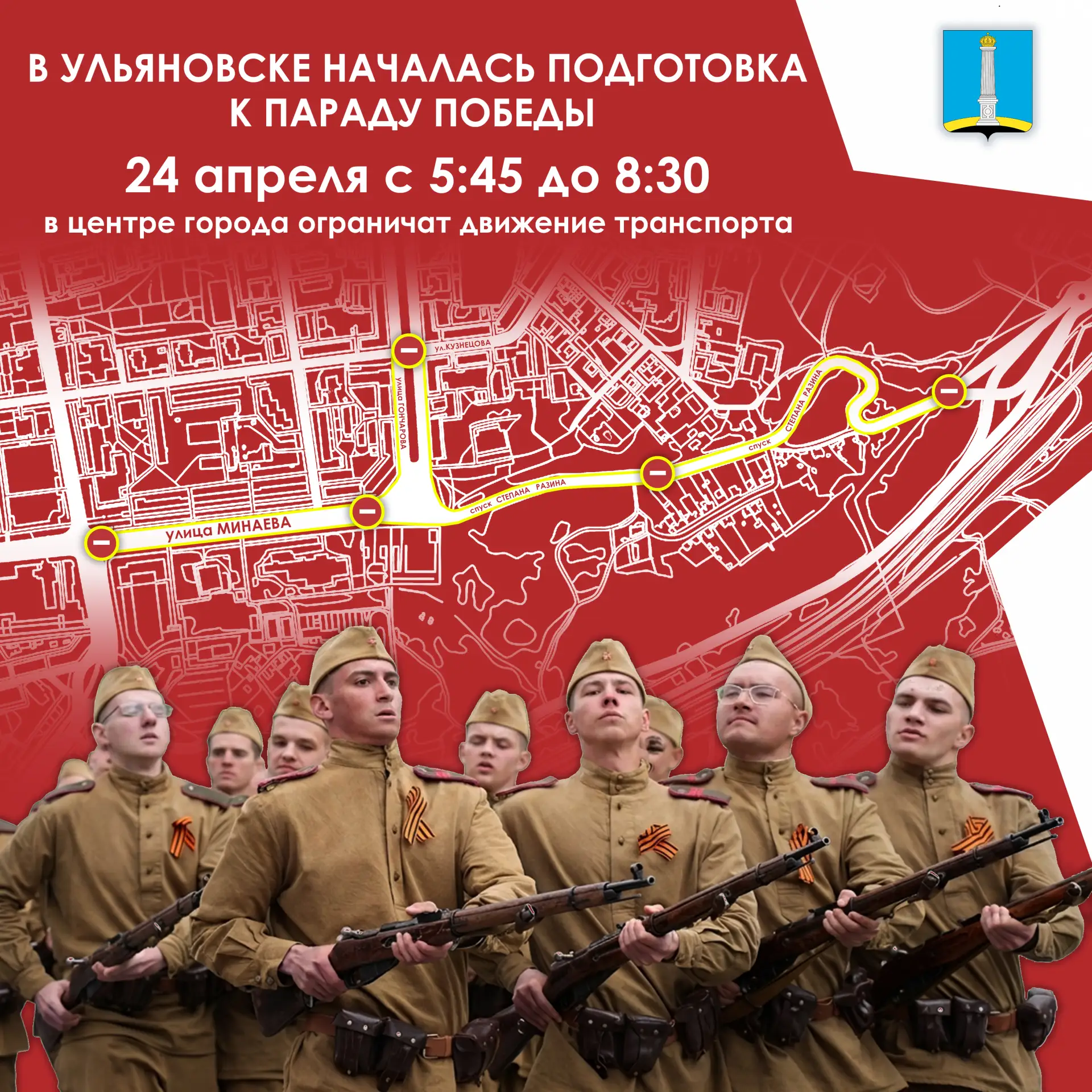 Напоминаем, что в рамках подготовки к празднованию 81-й годовщины Победы в Великой Отечественной войне в дни проведения репетиций в центральной части Ульяновска будет временно ограничено движение транспорта