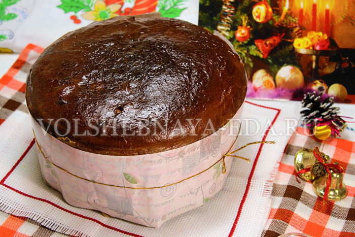 После подъема тесто обминают и добавляют крупно нарезанные цукаты и курагу. Затем снова дают ему подняться в форме, в которой планируется выпечка. Форму смазывают маслом и выстилают пергаментом. После этого прилежно готовится в разогретой до 180-190 градусов духовке в течение 45-50 минут.