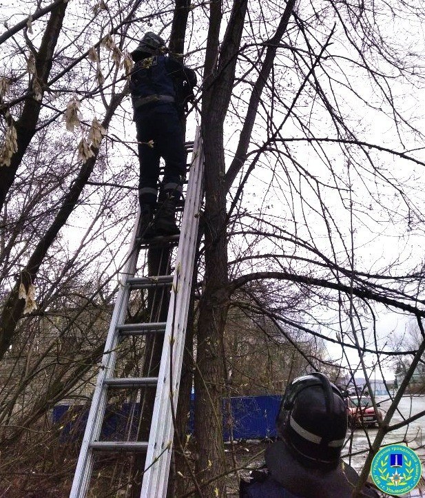 С помощью трехколенной лестницы спасатели сняли кота с опасной высоты, вернув его обратно на землю целым и невредимым.