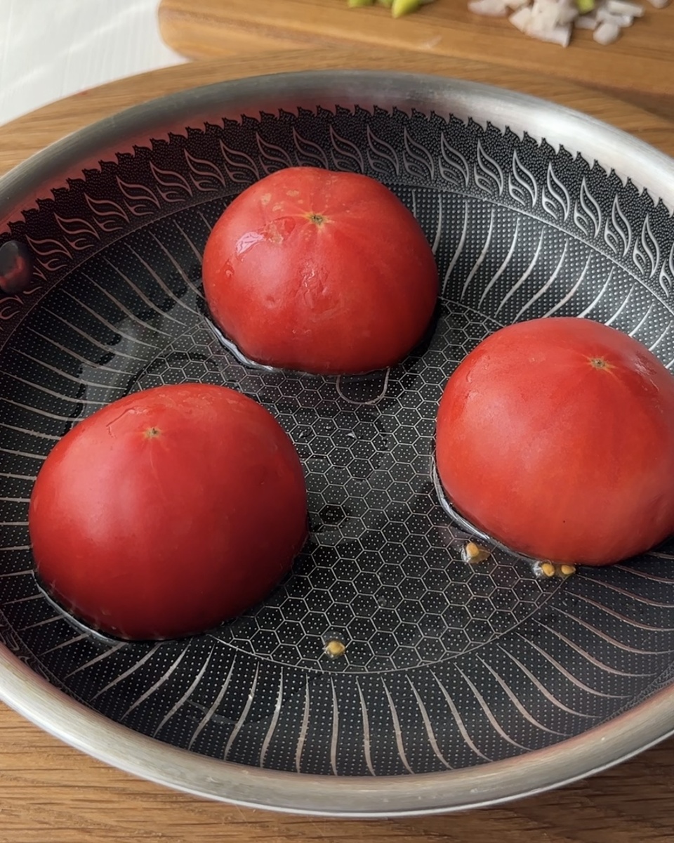 Когда масло хорошо прогреется, помидоры выкладываются в сковороду срезом вниз. В центральной части помещаются нарезанные лук, чеснок и перец. Эти овощи мы размещаем таким образом, чтобы они образовали своего рода "гнёздышко" вокруг помидоров. Накрываем сковороду крышкой и даем овощам немного потомиться в течение 5 минут, чтобы они стали мягче и хорошо пропитались ароматом.