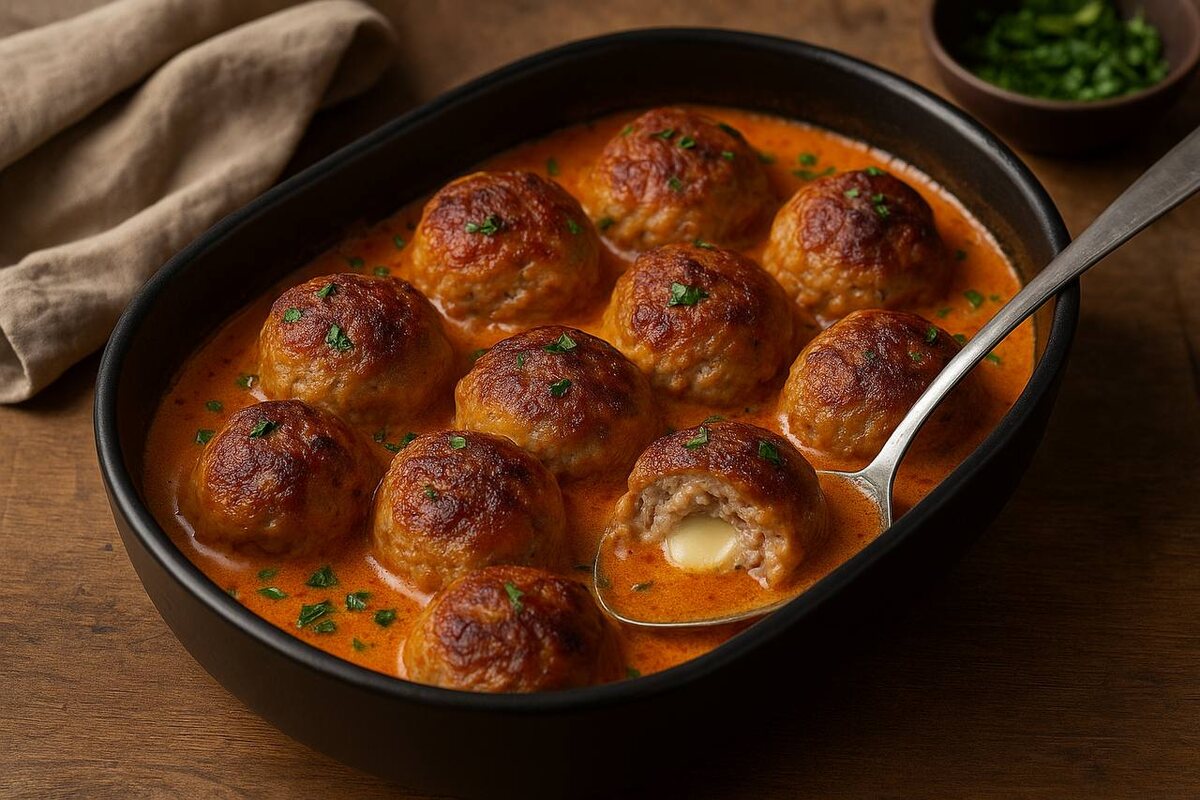Выложите сформированные тефтели в форму, залейте их приготовленным соусом, накройте фольгой и отправьте в заранее разогретую до 180 °C духовку на 30 минут. Затем снимите фольгу и дайте подрумяниться еще 10–15 минут для образования аппетитной корочки.